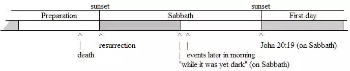 Here is a diagram to illustrate that the events from John 20:1 (before sunrise, yet on Sabbath) to John 20:19 (on Sabbath) happened the same day.