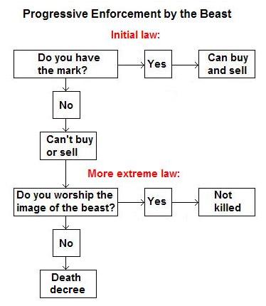 It seems there are two different actions required of all people one leading to the other. The order, logically, must proceed from restrictions on buying or selling to the more extreme measure of a death penalty. How could the false prophet restrict the buying and selling of people whom he has already killed? This is shown in the diagram below emphasizing that it will be personal choice that determines the outcome:
